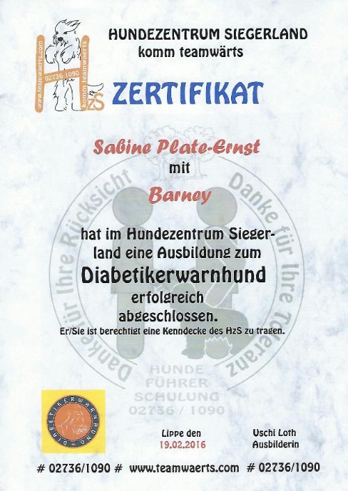 Am 19.02.2016 schließt Barney erfolgreich die Ausbildung zum Diabetikerwarnhund ab.
